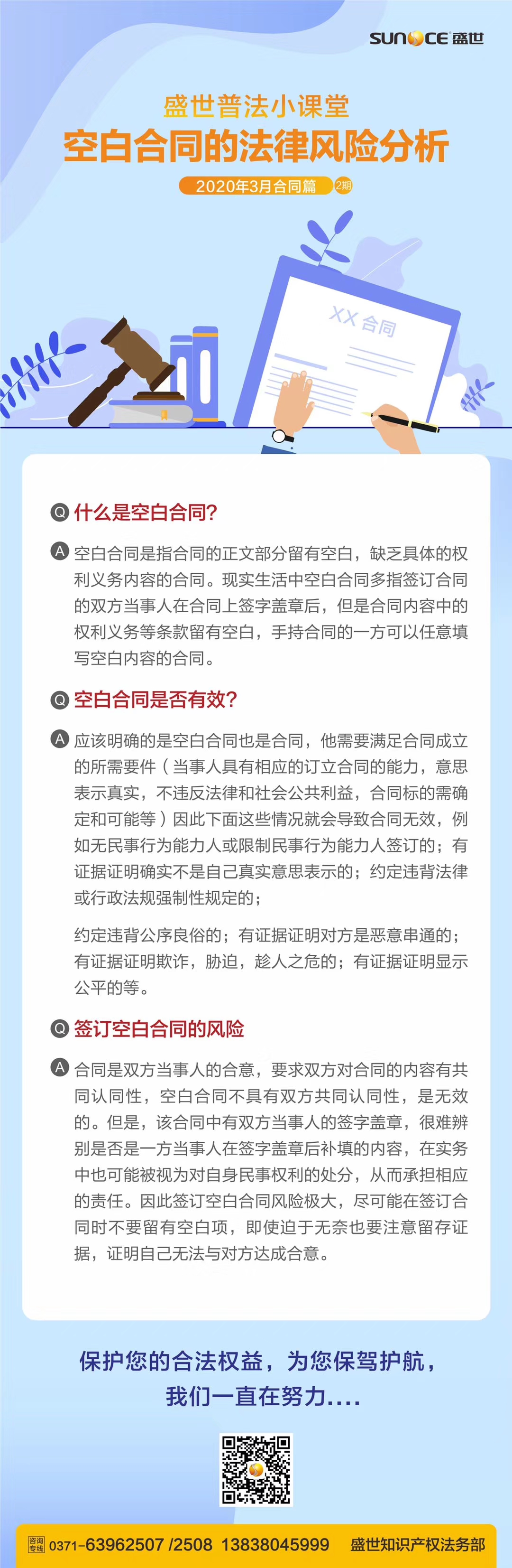 以上就是關(guān)于《企業(yè)該不該簽訂空白合同,究竟會不會有風(fēng)險》相關(guān)內(nèi)容,如果想了解更多相關(guān)內(nèi)容可以關(guān)注河南盛世知識產(chǎn)權(quán)官方網(wǎng)站。河南盛世知識產(chǎn)權(quán)成立于2005年,至今已有17年發(fā)展歷史,提供商標(biāo)注冊、專利申請、版權(quán)登記、高新技術(shù)企業(yè)認定等多項服務(wù),助力于企業(yè)發(fā)展。咨詢熱線:17324810679(微信同步)