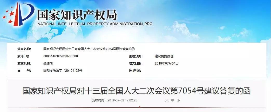 國家知識產(chǎn)權(quán)局對十三屆全國人大二次會議第7054號建議答復的函