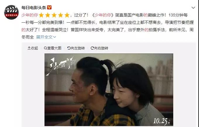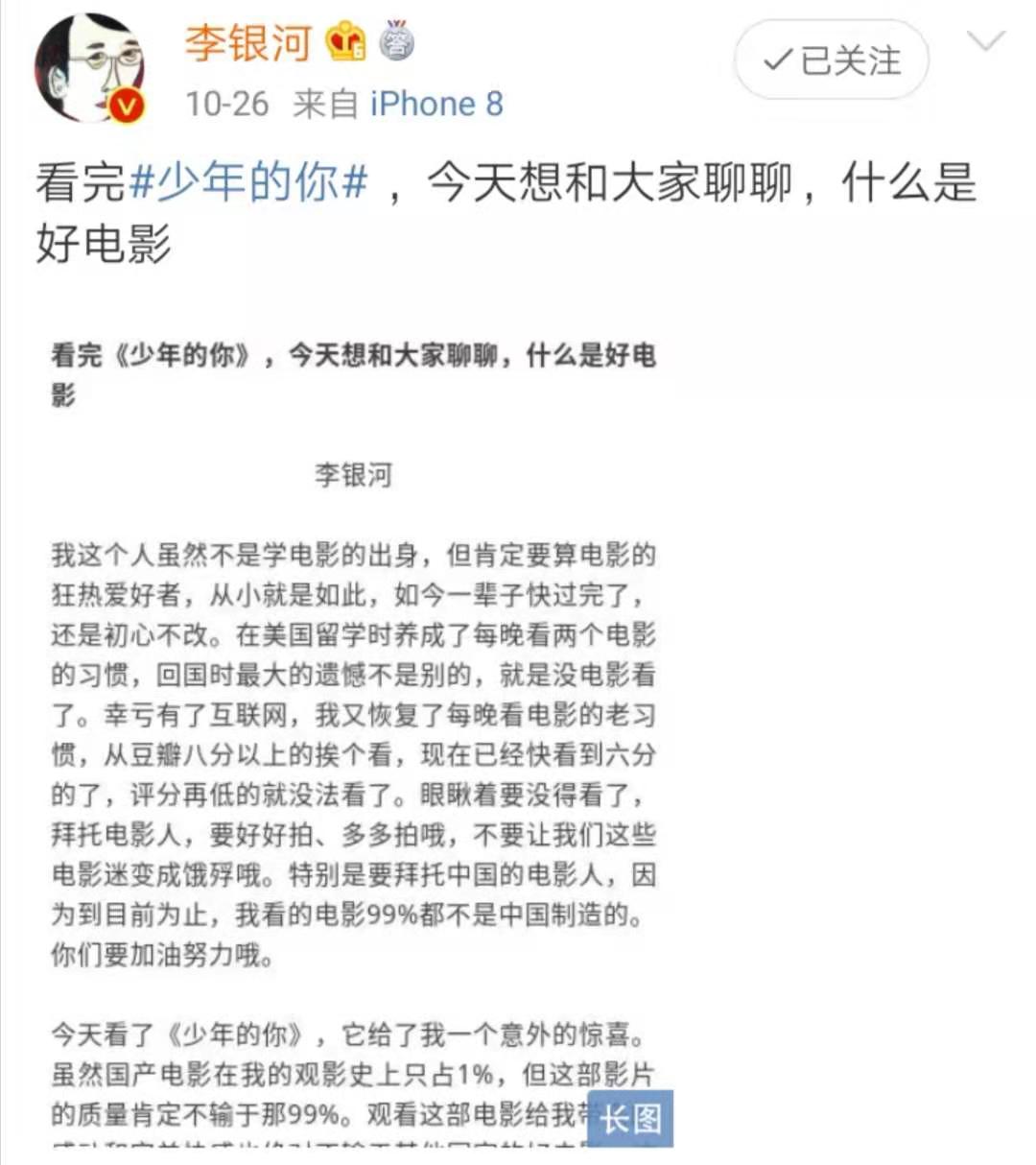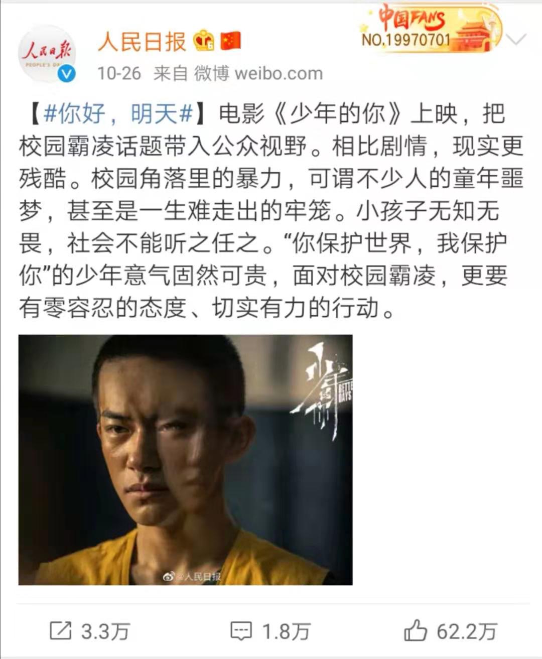 中國著名社會(huì)學(xué)家李銀河在微博中發(fā)長文點(diǎn)贊,稱“不看《少年的你》,就錯(cuò)過一次美好的審美體驗(yàn),就不會(huì)知道中國電影現(xiàn)在已經(jīng)好到什么程度。”