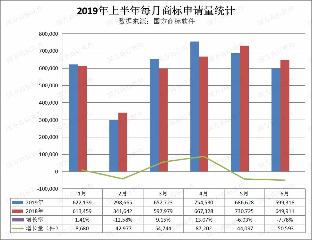 近日,國方商標(biāo)軟件發(fā)布“2019年上半年每月商標(biāo)申請量統(tǒng)計表”。數(shù)據(jù)顯示,2019年上半年我國商標(biāo)申請量為3614003件,較2018年同期增長0.36%。